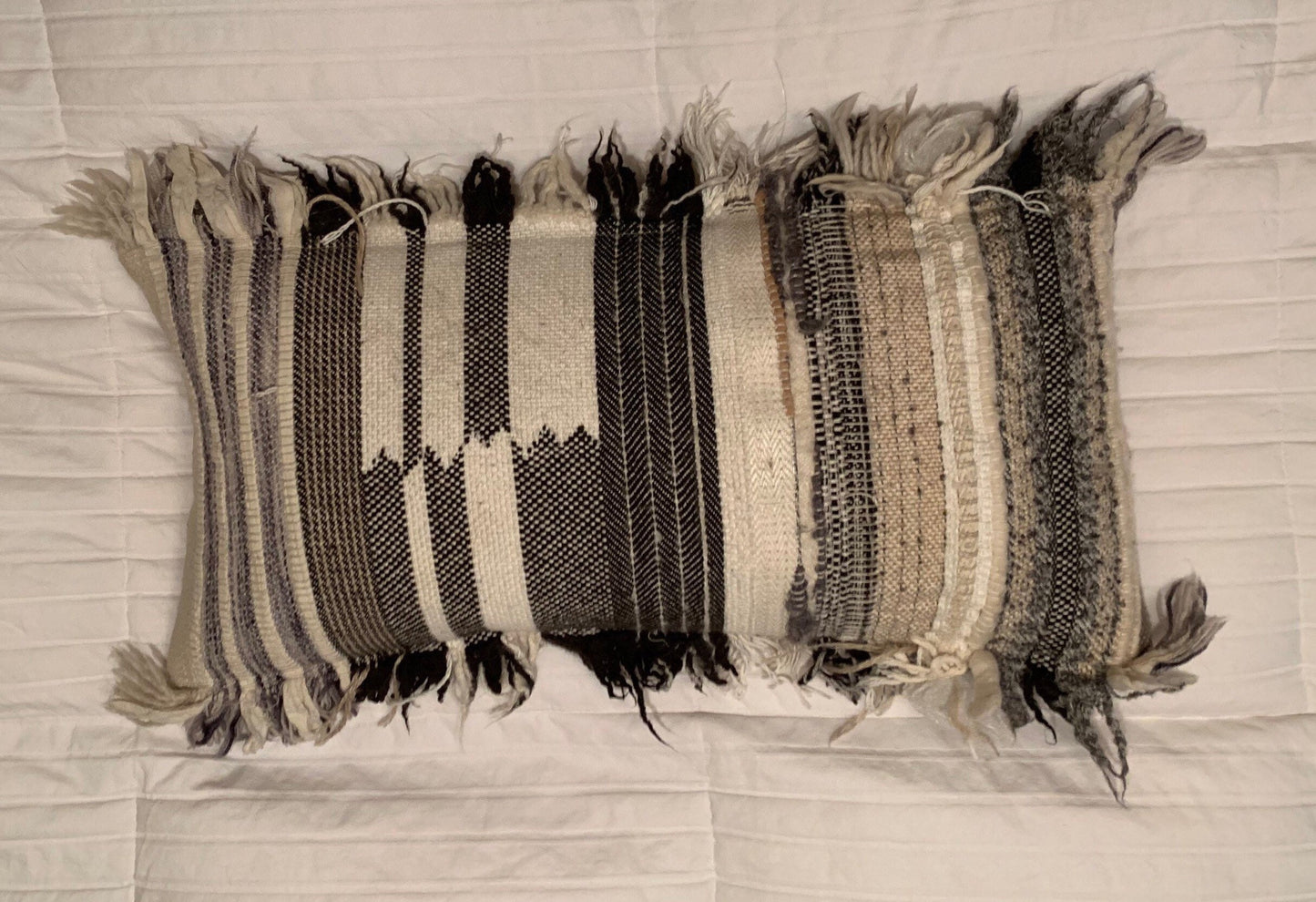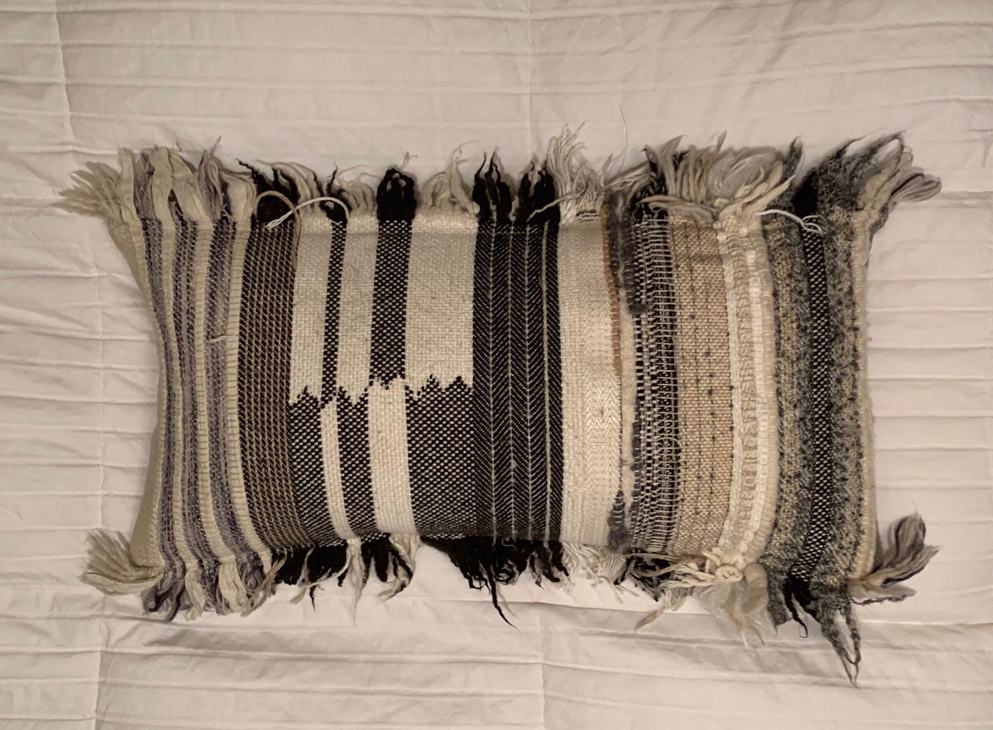 Down feather bolster pillow with various yarn woven fabric design and rough edge fringe. Checkerboard cotton fabric on back.