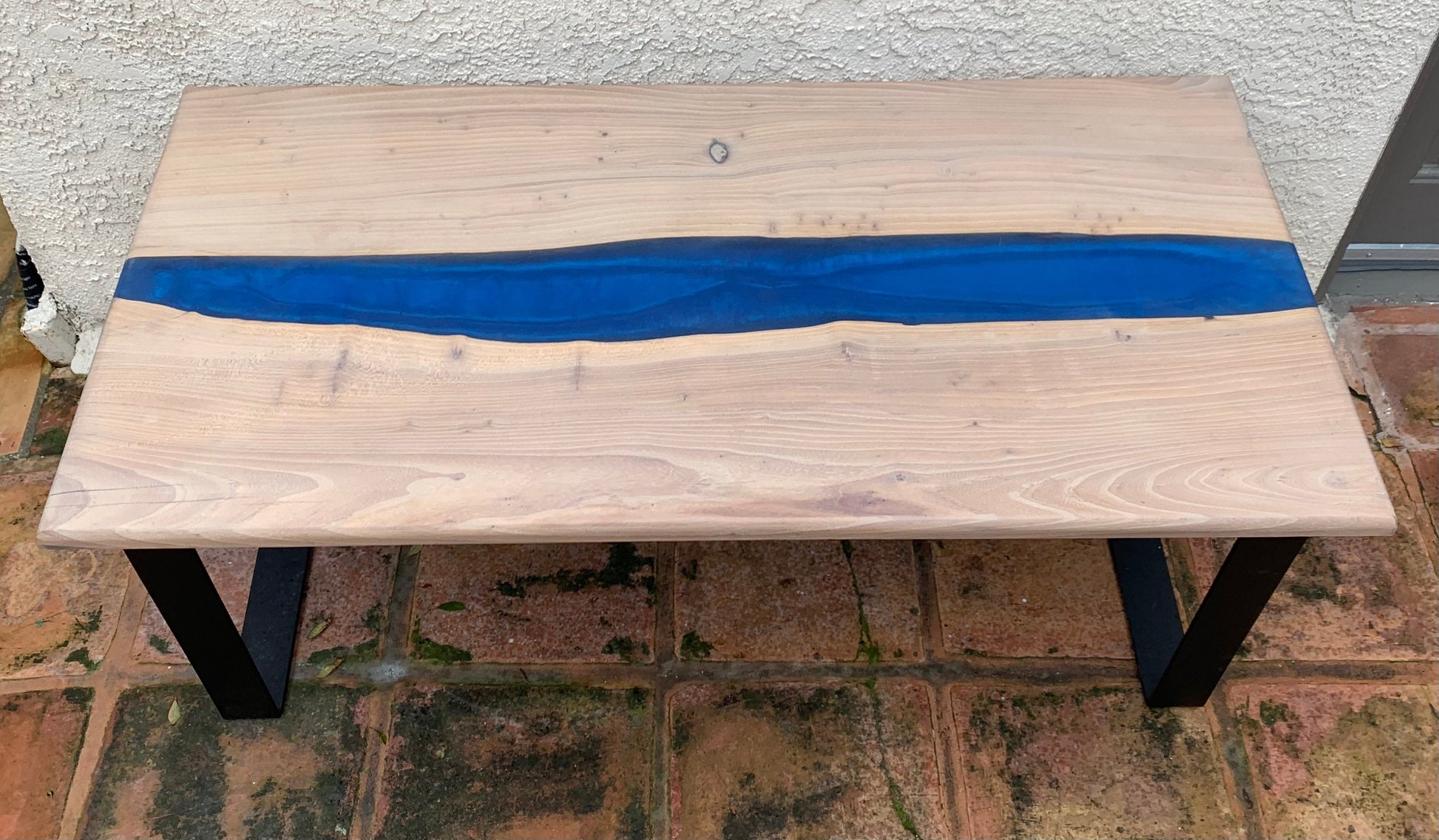 Contemporary custom made resin and wood coffee table mounted on heavy iron flat bar metal legs. Created in southern California by a local furniture artisan.