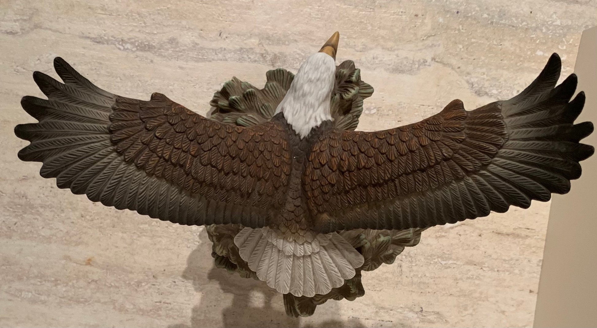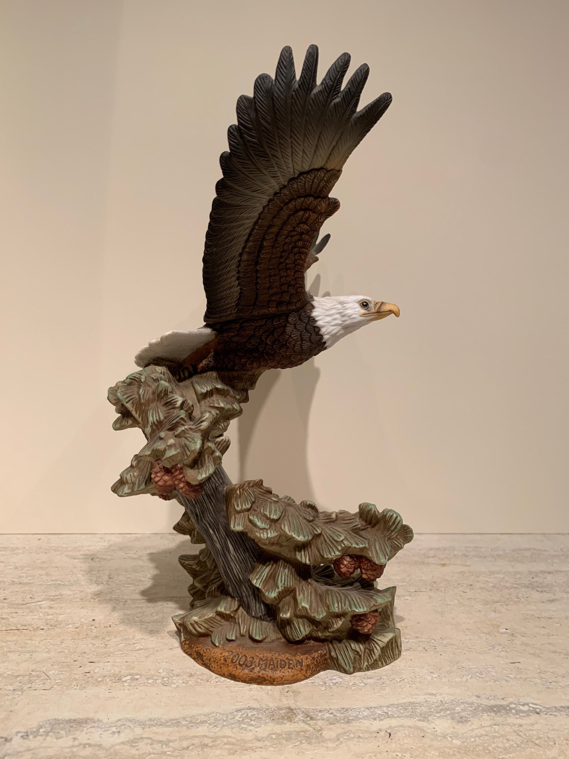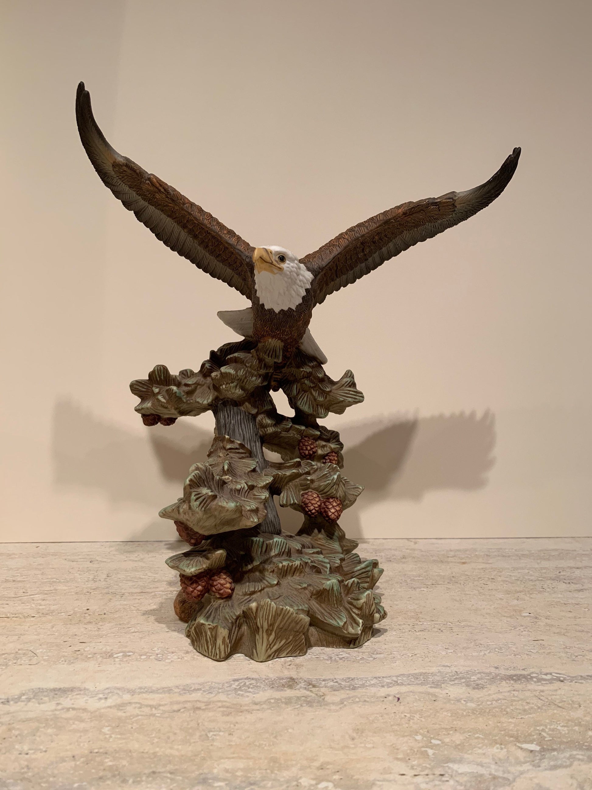 Painted Ceramic statue of an eagle resting on the a tree branch with wings spread. From the Crystal Cathedral ministries eagles club, 2003.