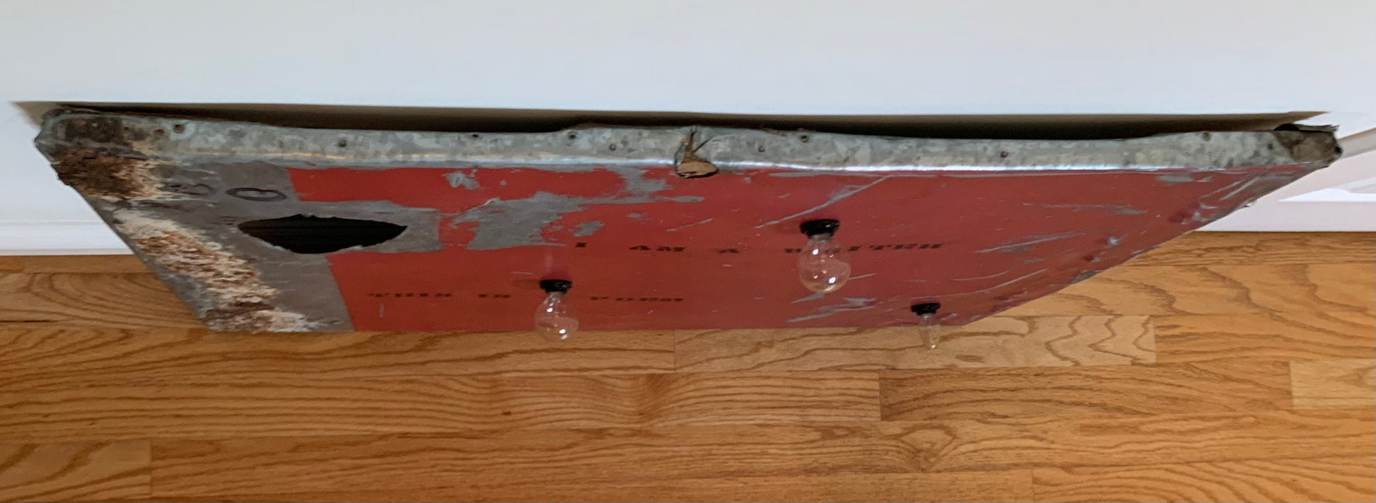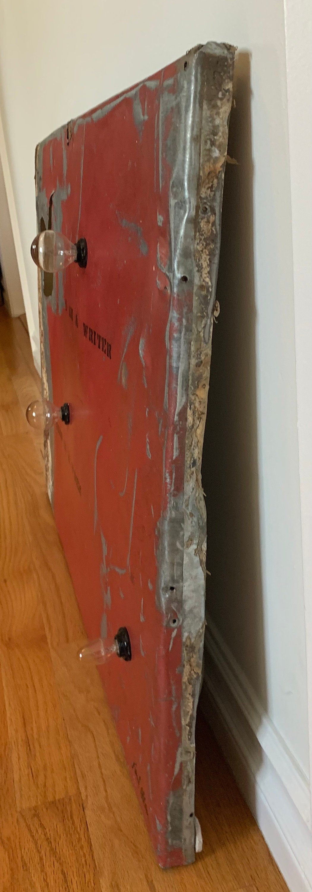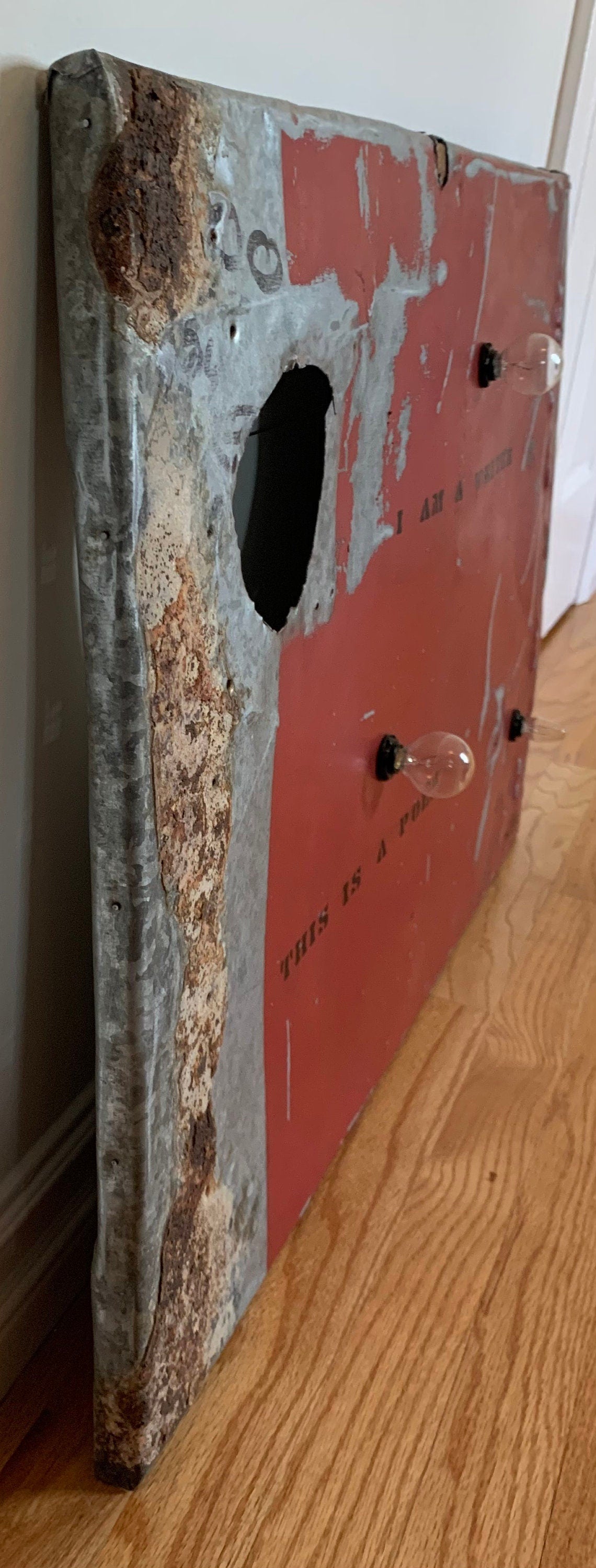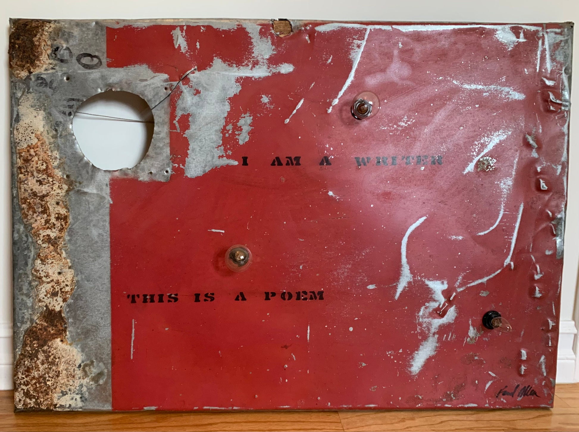 Original art "I am a writer; this is a poem" by Ford Allen. Painted sheet metal mounted on wood frame and wired for lighting.