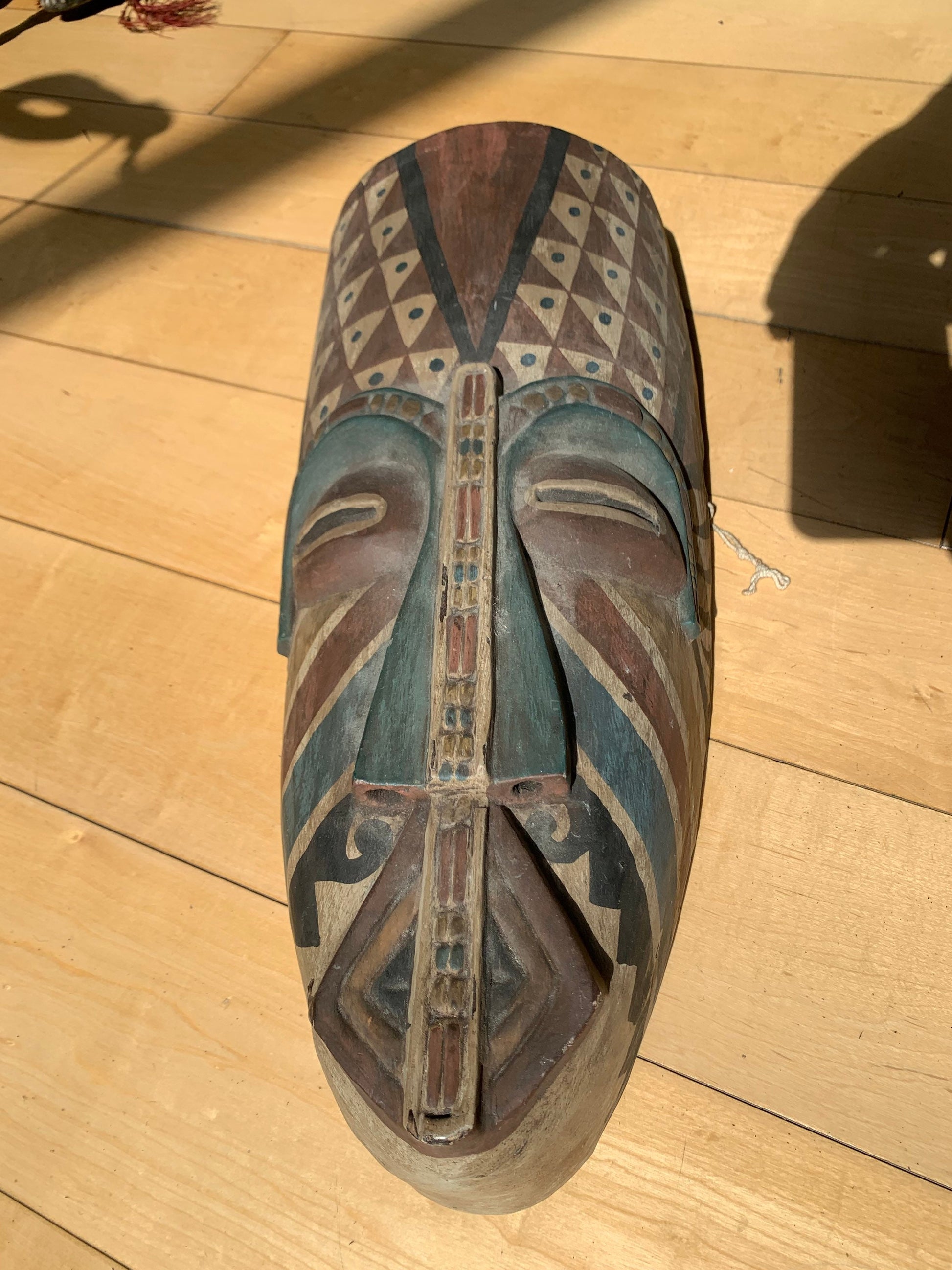 This oblong shaped wooden mask from Bali, Indonesia mask was created for a decorative purpose.