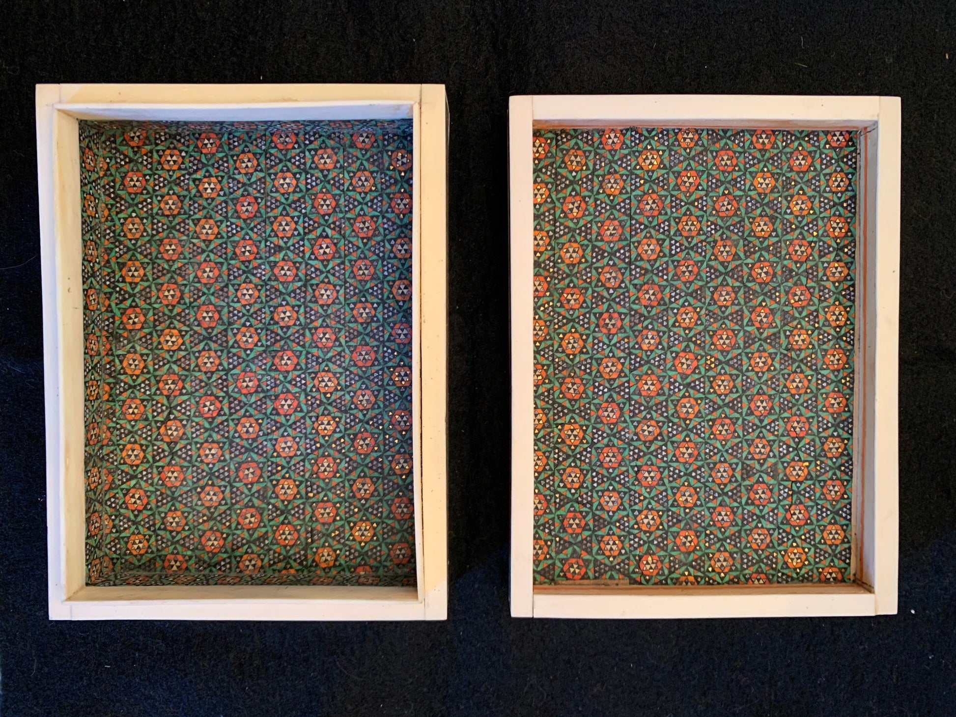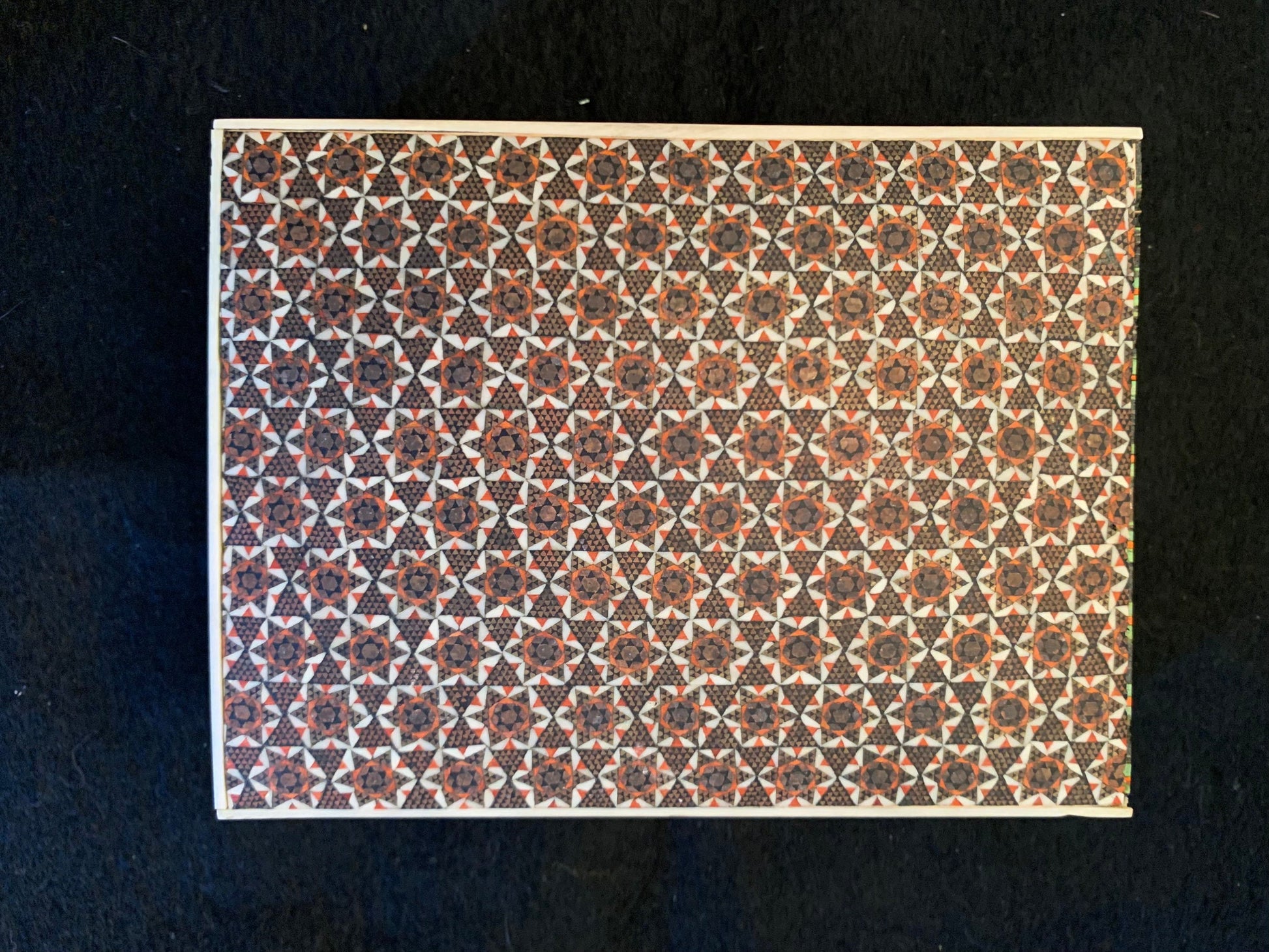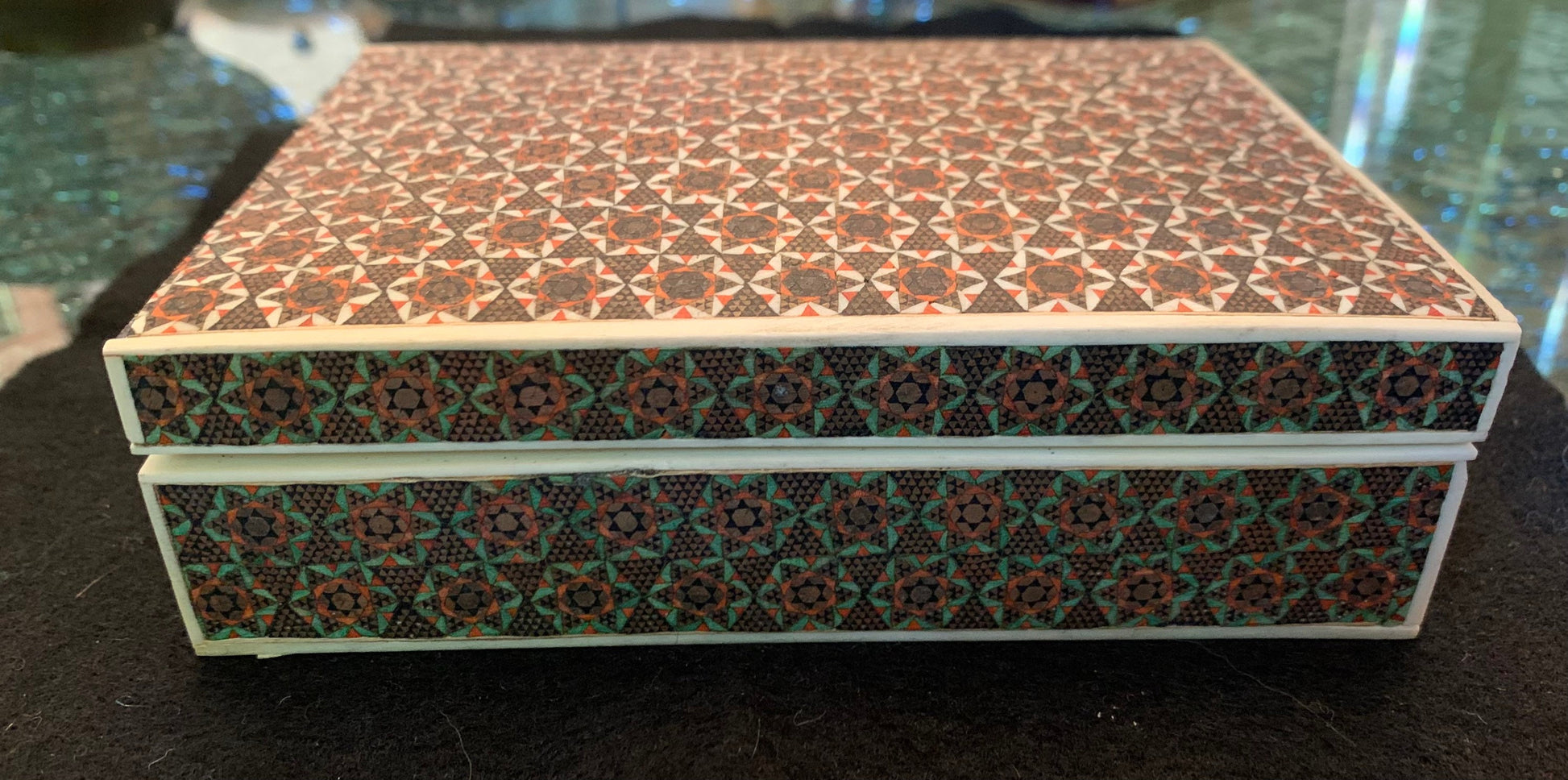 Vintage Wood Box. Box completely embellished with exotic inlay on the interior and exterior, possibly bone.