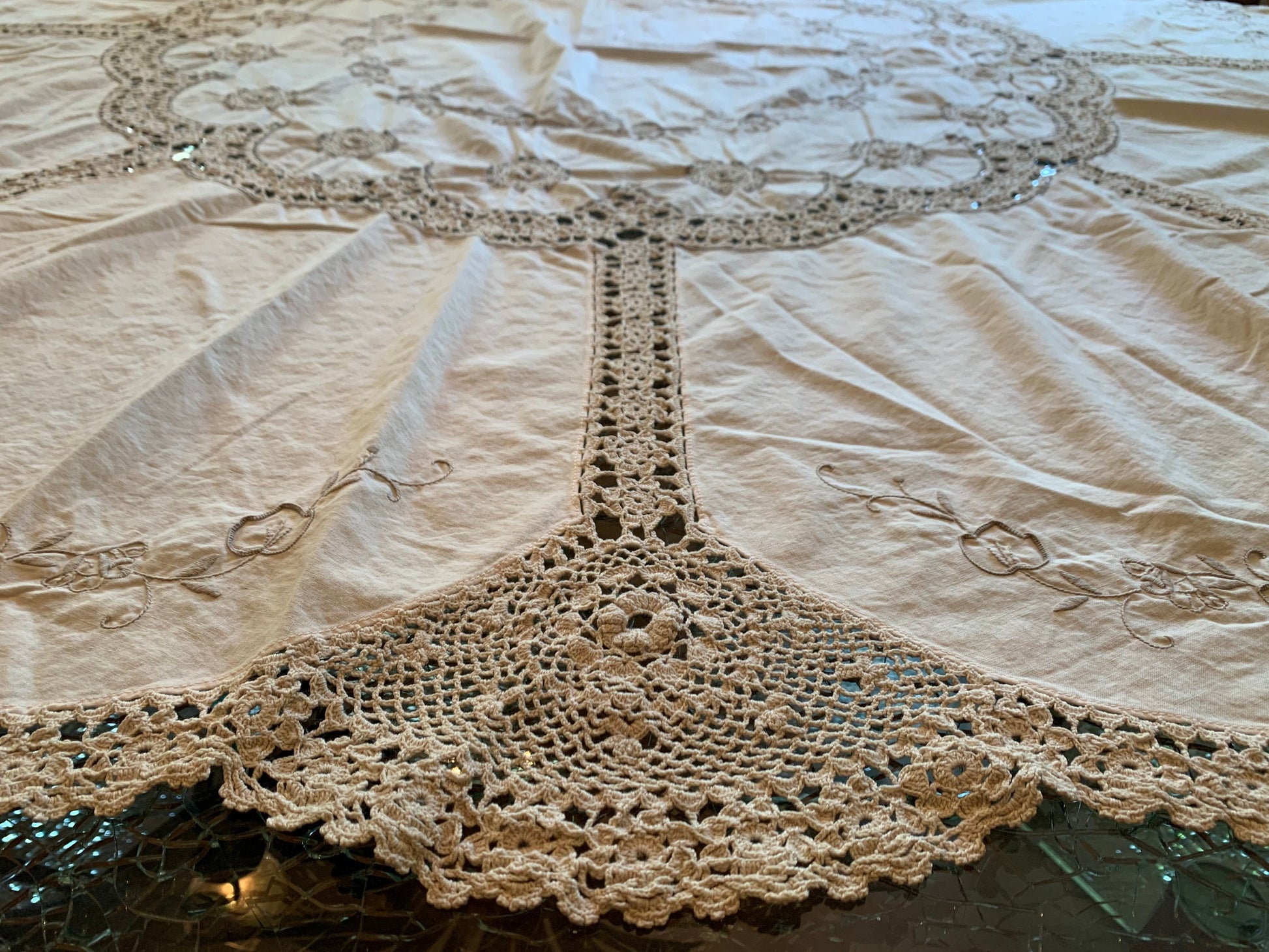 Vintage beige cotton crocheted tablecloth. In great condition and no stains.