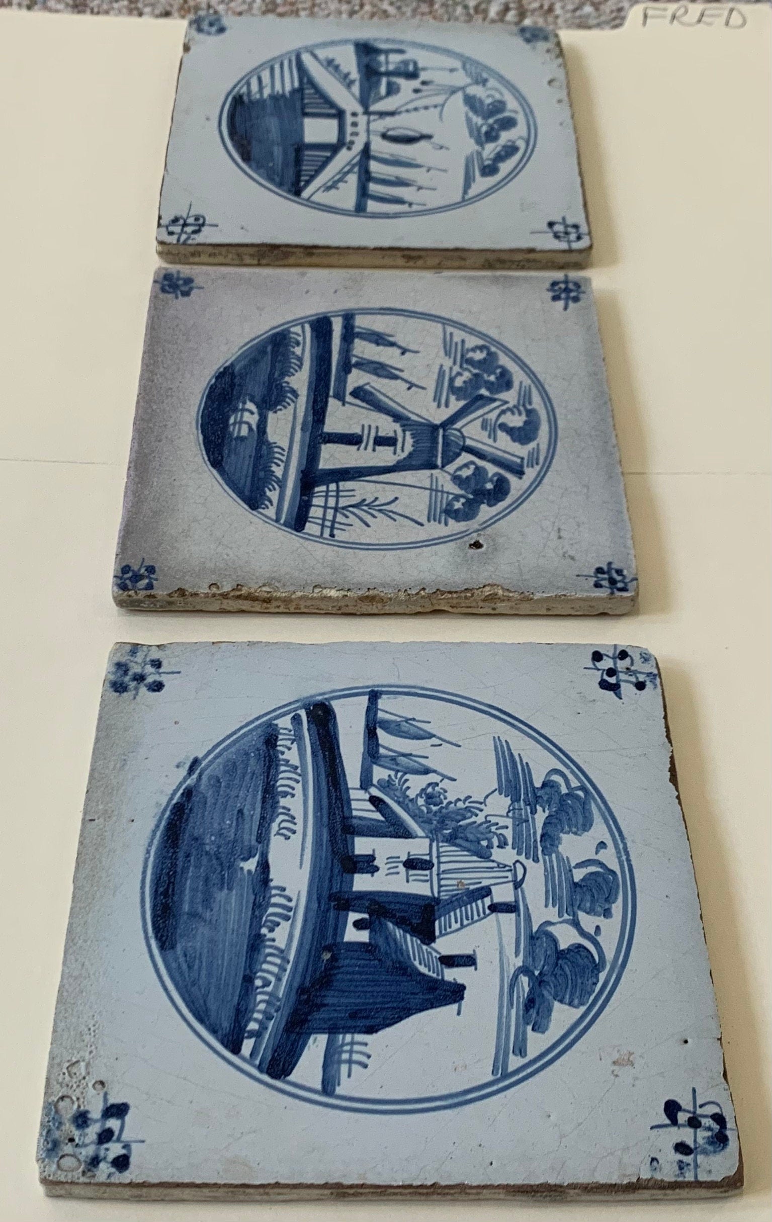 Vintage Handmade Delft Clay Tiles, set of 3. 5”H x 5”W x 3/8”D