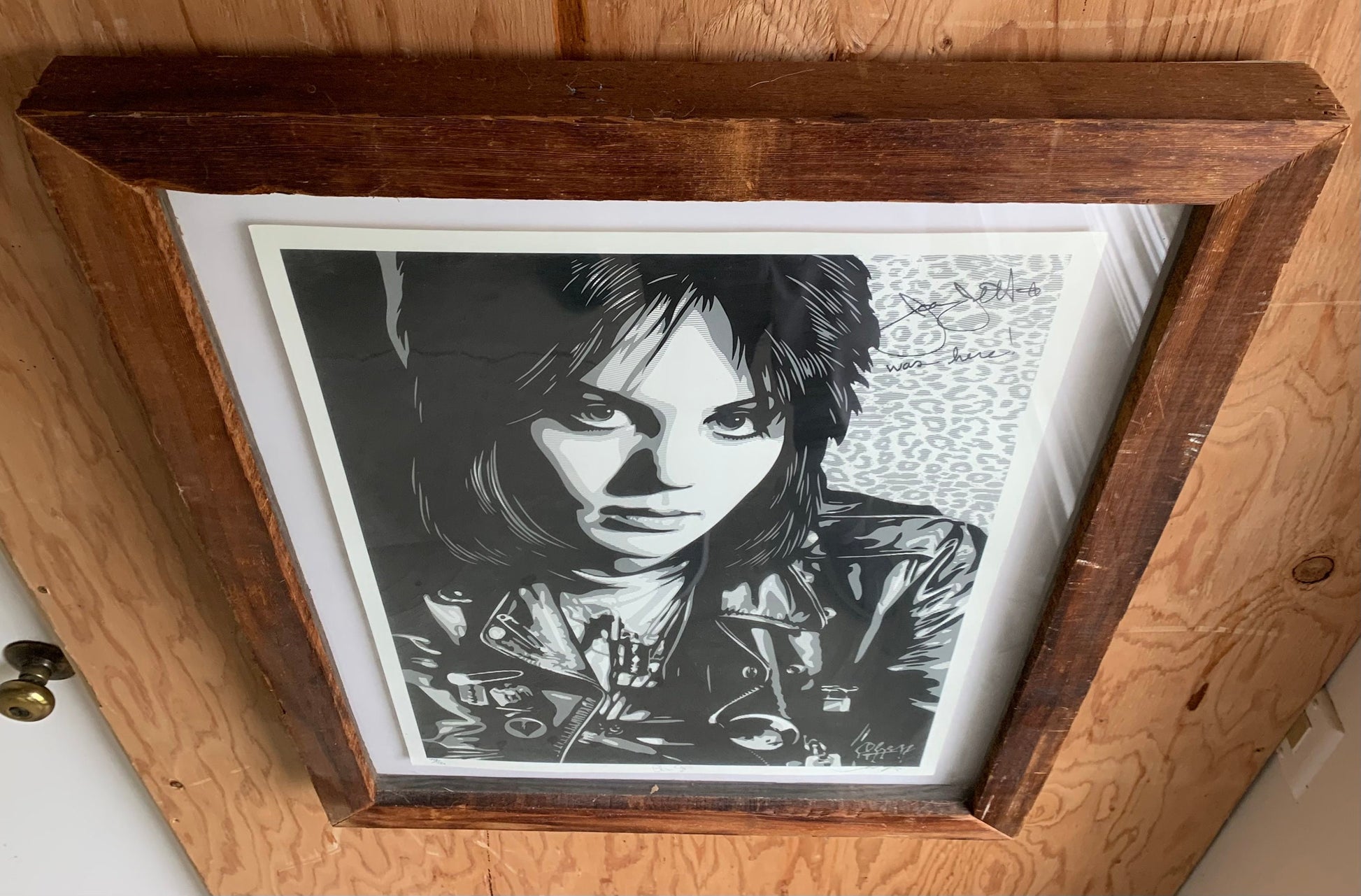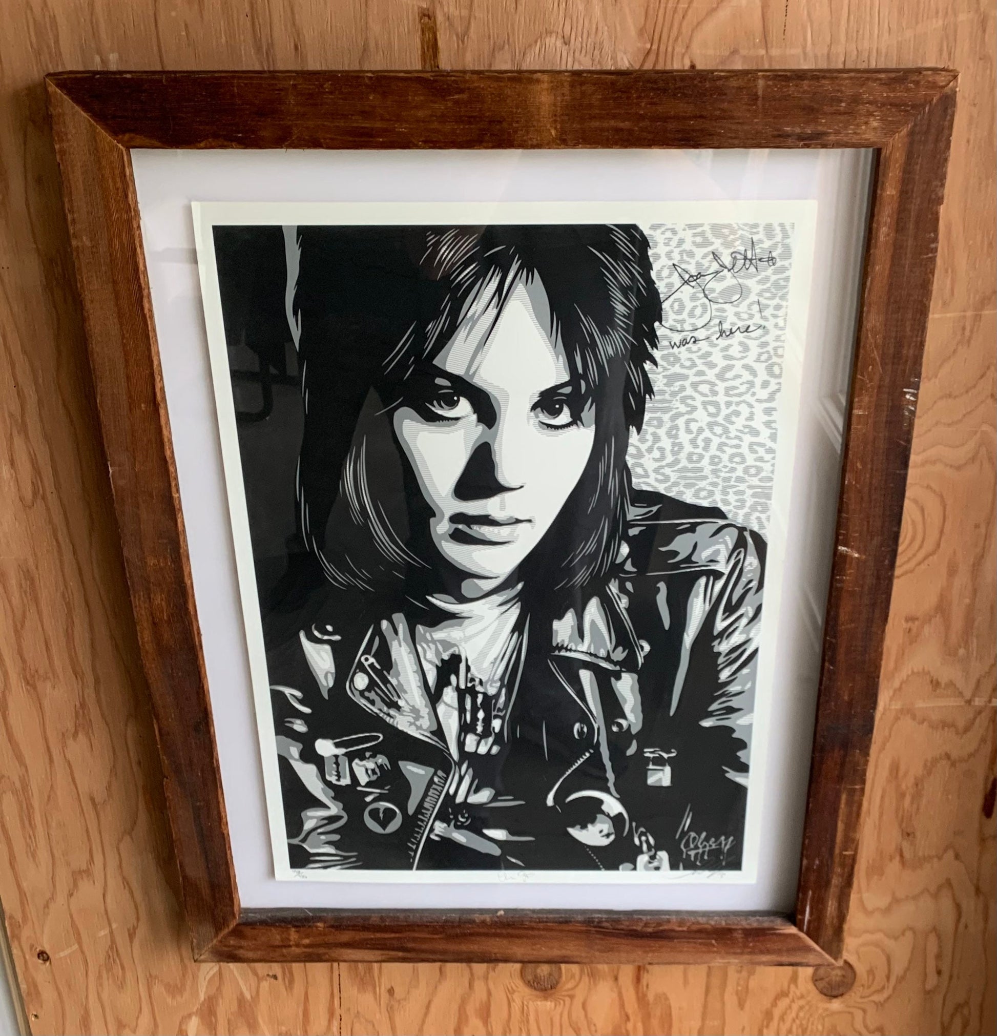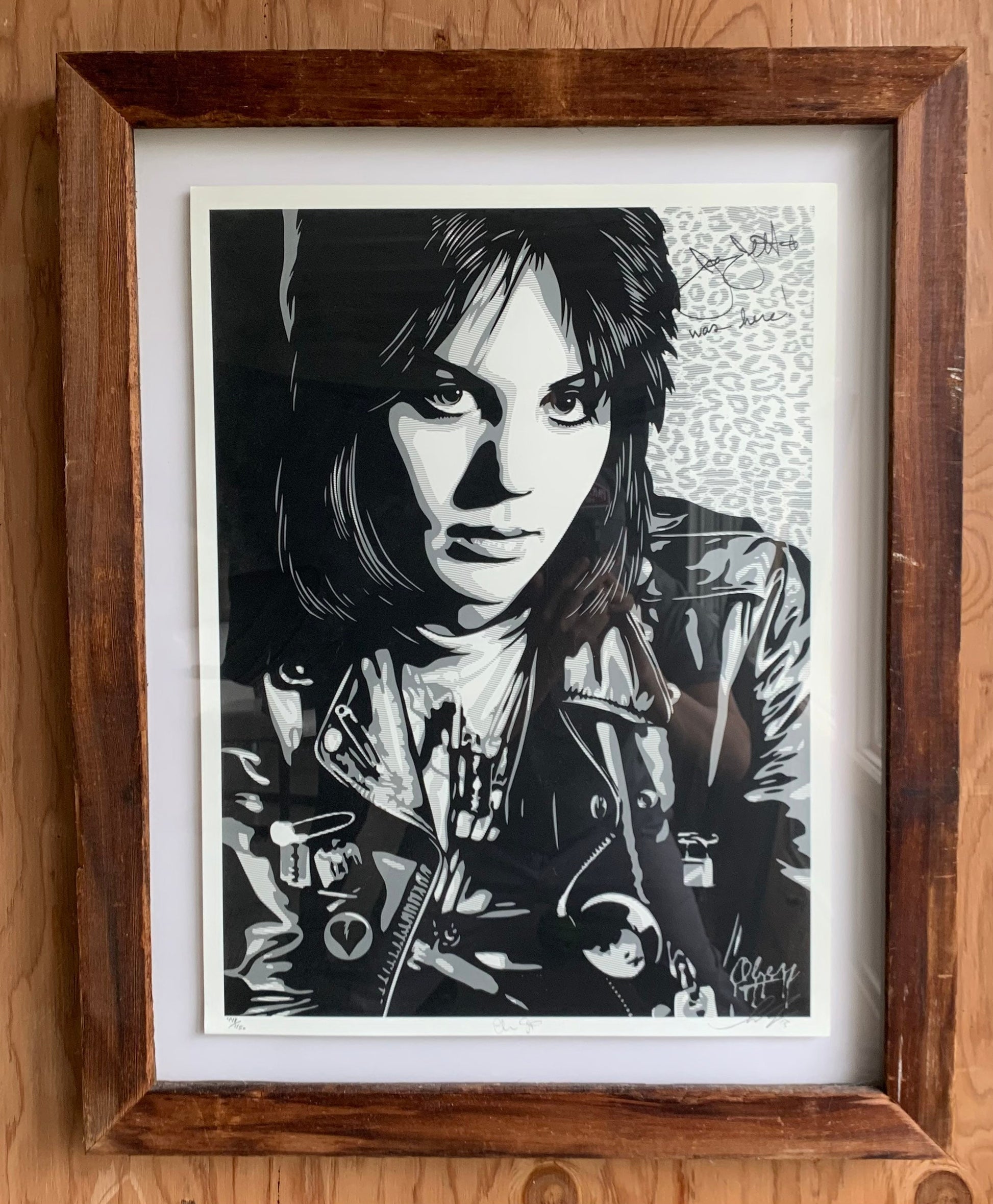 Screenprint "Joan Jett The Runaway" in custom reclaimed wood frame. Signed by Shepard Ferry (who did president Obama's portrait) and signed by Chris Stein (of Blondie fame) who took the picture. Also signed by Joan Jett. 2013. Artwork 17w x 24”