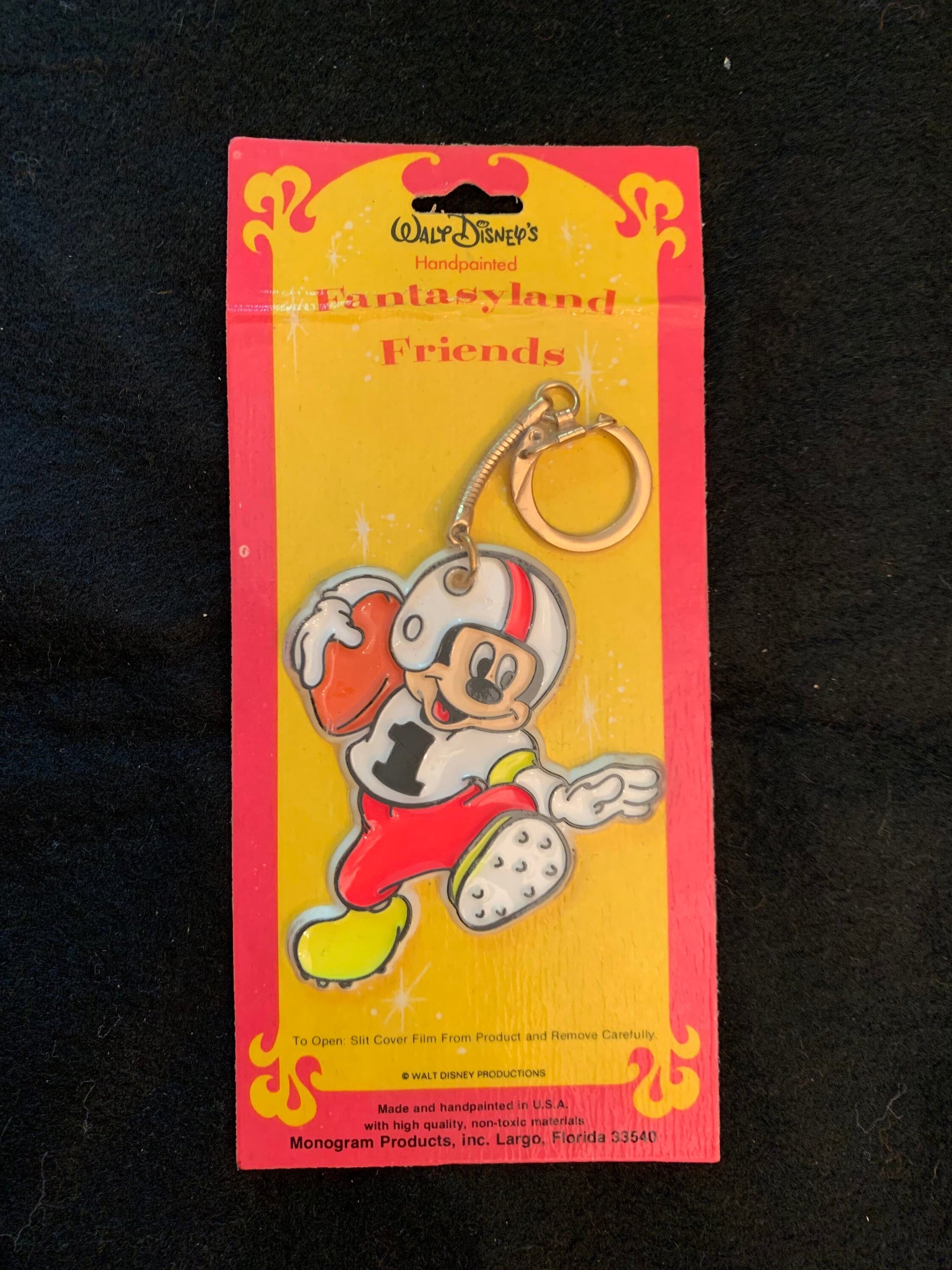Vintage Mickey Mouse Plastic and Metal Football Key Chain in new unopened condition.
