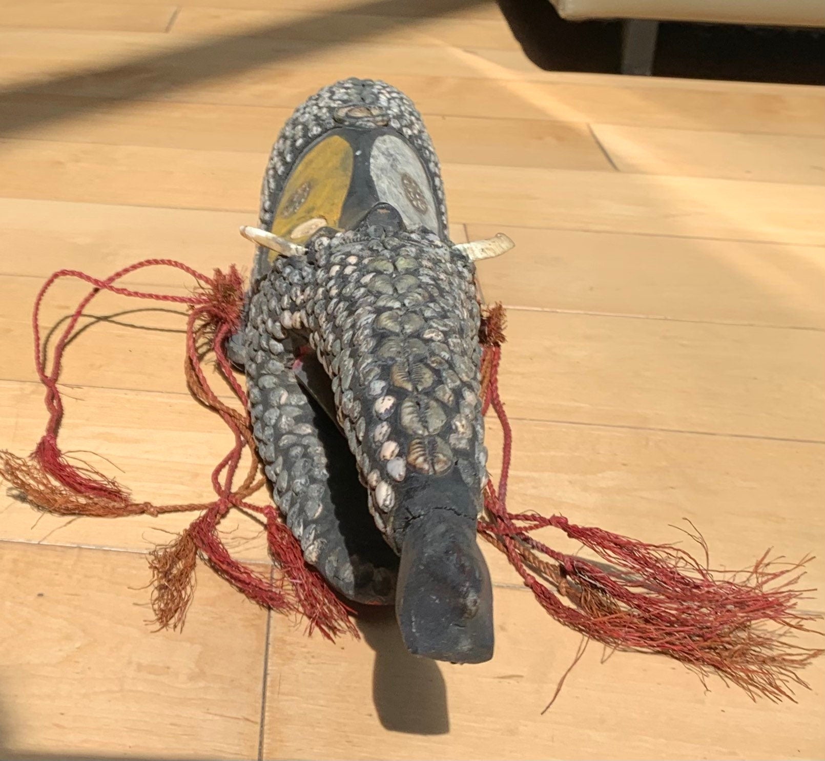 This is a wooden Middle Sepik River Mwai or Mei mask with conus and cowry shells, of the Latmul